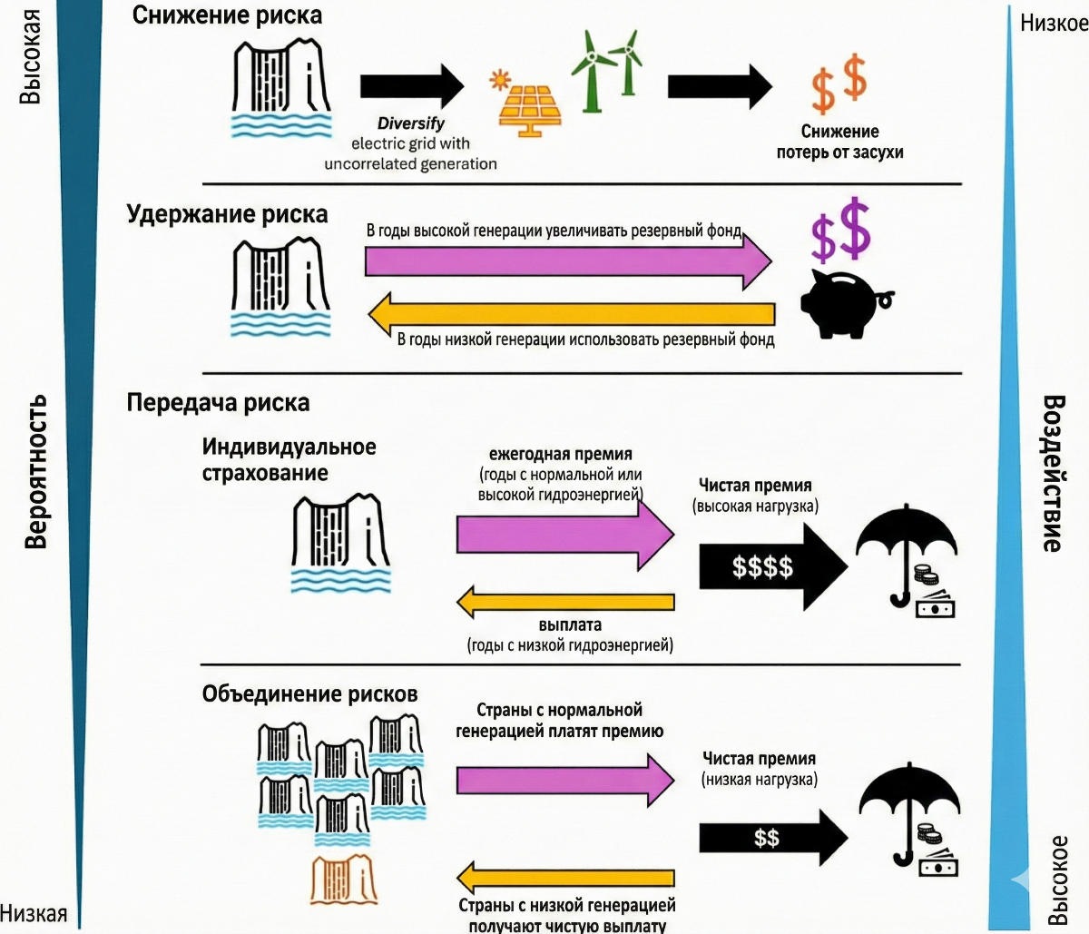 В исследовании под названием «Глобальное объединение рисков смягчает финансовые последствия засухи в странах, зависимых от гидроэнергетики» предлагается подход совместного страхования. Он позволяет распределить риски засухи между несколькими странами. Поскольку засушливые условия редко затрагивают все регионы одновременно, объединение страховых контрактов в общий пул снижает общую подверженность рискам и, как следствие, уменьшает размер страховых взносов.